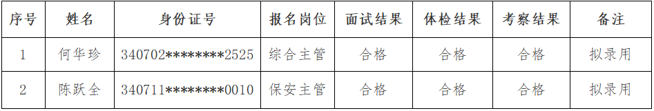 ? 根據(jù)《銅陵保祥城市服務(wù)有限公司招聘工作人員公告》規(guī)定,經(jīng)過報名、面試、體檢、考察等環(huán)節(jié),現(xiàn)將擬錄用人員公示如下(見附件)。